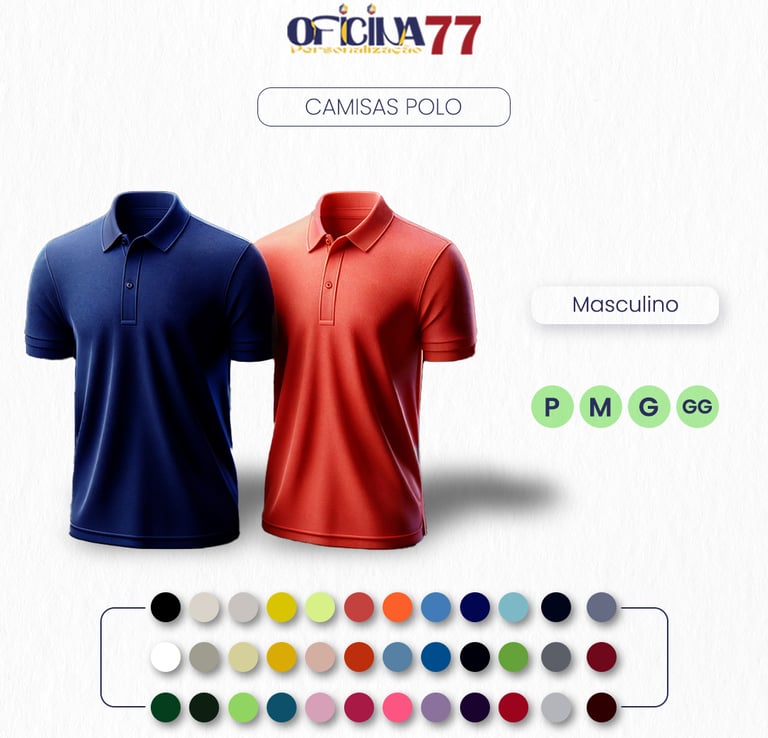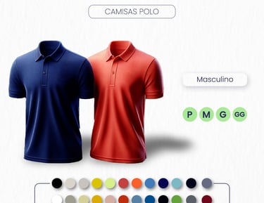 Camisas Polo em diversos tipos de tecidos como, Piquet, Malha fria e Poliéster com uma grande variedade de cores.